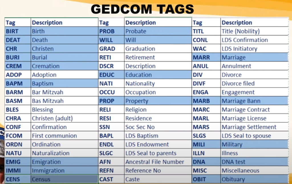 Ondanks dat fraaie begin bleek het voor mij moeilijk het stamboomonderzoek door te zetten naast mijn werk. Ik legde wat ik gekregen had vast met behulp van een computerprogramma. Let wel, het was nog geen 1995, dus gebruikte ik geen uitgebreid en modern grafisch programma om dit te doen. Ik meen me te herinneren dat het Pro-Gen was, een programma dat werkte onder DOS. Daar bleef het zo’n beetje bij en pas 30 jaar later vond ik het oude bestand terug. ‘Familie Engel.ged’ stond nog steeds op een harde schijf (nadat ik het van een floppy disk had overgezet!). Ik ging ermee aan de slag, omdat ik nu eindelijk tijd en gelegenheid had om dat onderzoek voort te zetten. ‘ged’ staat trouwens voor GEDCOM, een formaat voor uitwisseling van gegevens, dat al vroeg in het tijdperk van de computer is ontwikkeld door leden van de meest beroemde kerkelijke organisatie die zich bezighoudt met stamboomonderzoek, de LDS. In de afbeelding zie je enkele van de afkortingen die al meer dan 50 jaar geleden werden afgesproken. Waarom zij dat doen, daar besteed ik later nog wel eens een bericht aan.