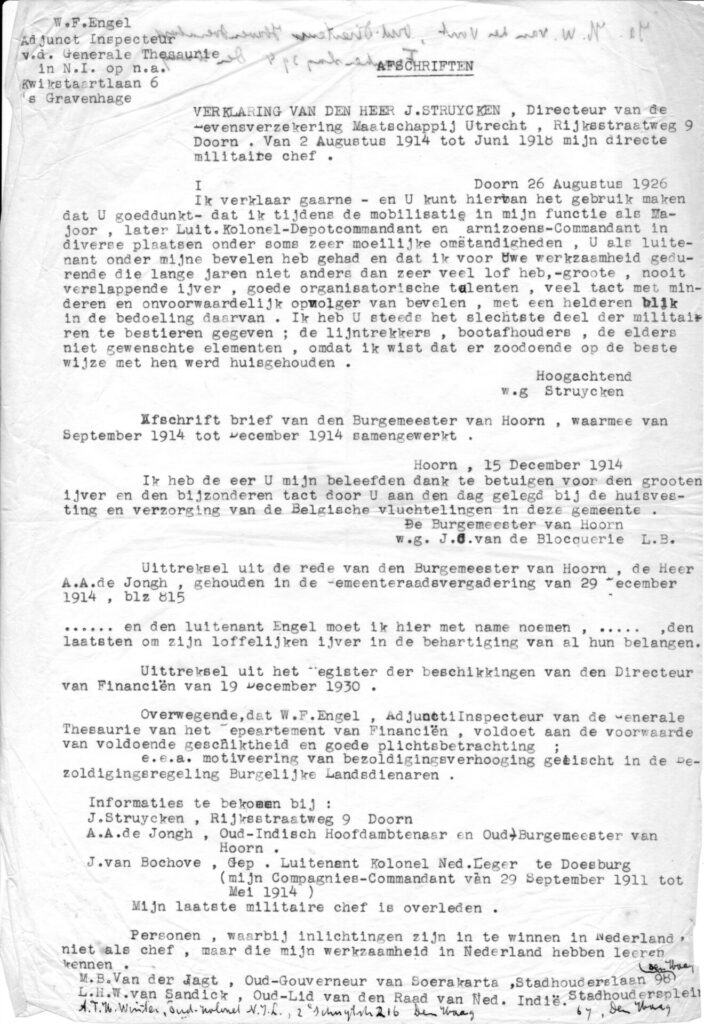 Bijna twee derde van de brief wordt in beslag genomen door de lovende woorden die commandant en burgemeester hadden voor zijn bijdrage aan organisaties in verband met zijn militaire loopbaan voor 1920, de hulp aan vluchtelingen van de Eerste Wereldoorlog, waarover ik al schreef. Het is vooral de bedoeling om aan te tonen dat Wim Engel iemand is op wie je kunt rekenen om op het juiste moment de juiste handelwijze te vinden. Een man die dat gezagsgetrouw en met overtuiging uitvoert. Je kunt dat lezen in de transcriptie. Hij sluit dat stuk af met de samenvatting van zijn 10 jaar activiteit in Nederlands Indië, die neerkomt op: “Men gaf mij een opdracht. Ik voldeed aan de eisen en liet daarin plichtsbetrachting zien. Dit kwam tot uitdrukking in verhoging van mijn salaris.” Wie zou het niet zo doen als hij op zoek was naar een nieuwe betrekking? Afsluitend wordt gedeeld: “Informatie te bekomen bij: ” Dan lees je namen van de schrijvers van de erboven genoemde lovende teksten. So far, so good.