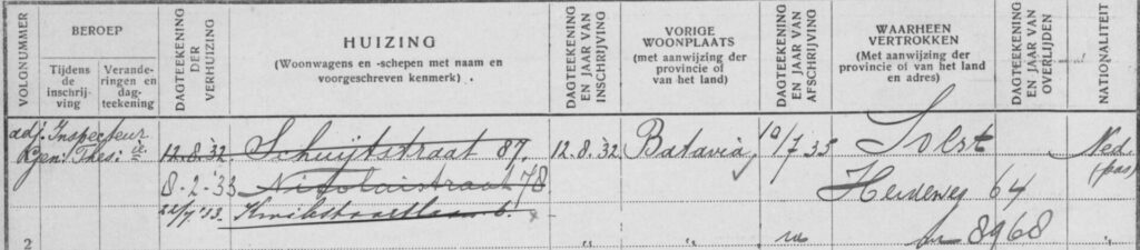 De onderste regel is eveneens van belang. Daarvoor moet je even de combinatie maken met de Gezinskaart uit Den Haag zoals die tot 1940 werden opgemaakt. Daarbij staan de 4 leden van het gezin genoemd op de voorzijde, te weten Wim Engel senior, Henriëtte de Reede plus de 2 kinderen Wim junior en Han. Op de achterzijde staat het adres of de adressen in de stad of het dorp….. Zoals gewoonlijk zie je weer dat de familie Engel de gewoonte had om vaak te verhuizen. Op tijd van een paar jaar 3 keer. In augustus 1932 komen wonen in de Schuytstraat 87, dan een half jaar later in februari naar de Nicolaistraat 78 en tot slot juli van datzelfde jaar naar de Kwikstaartlaan nummer 6, waar zij tot 10 juli 1935 zouden blijven wonen.